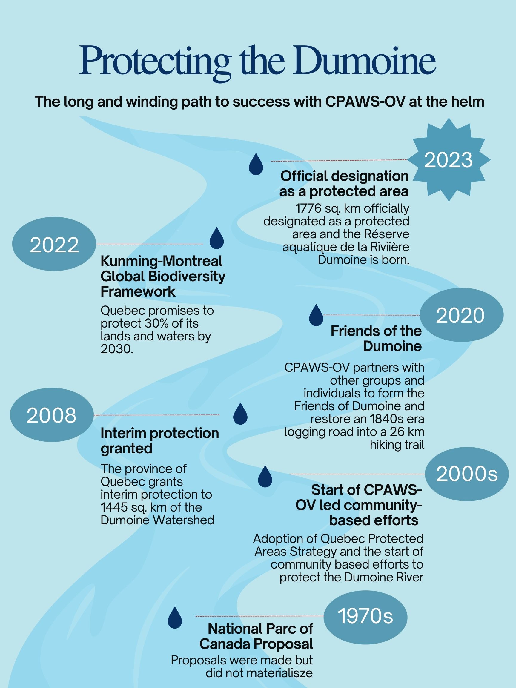 Au début des années 2000, des efforts ont été amorcés sous le leadership de CPAWS-OV, qui a mobilisé la communauté pour protéger la rivière Dumoine. Après des années de campagnes et de travail concerté, ces démarches ont mené, en 2023, à la désignation officielle de 1 776 kilomètres carrés à titre d’aire protégée. Cette nouvelle réserve porte le nom officiel de Réserve aquatique de la Rivière-Dumoine.